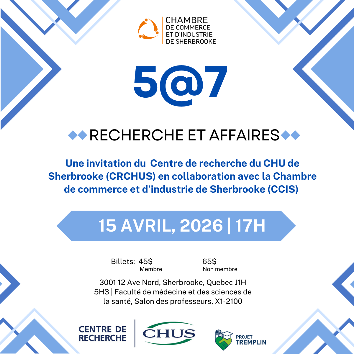 La Chambre de commerce et d’industrie de Sherbrooke (CCIS) et le Centre de recherche du CHU de Sherbrooke (CRCHUS) vous invitent à une soirée immersive dédiée au maillage entre le milieu des affaires et celui de la recherche scientifique.